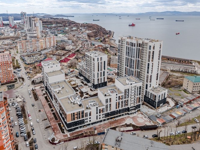 Из множества квартир комплекса открывается прекрасный вид на просторы Амурского залива. Можно любоваться потрясающими закатами, морским пейзажем прямо из окон собственной квартиры.