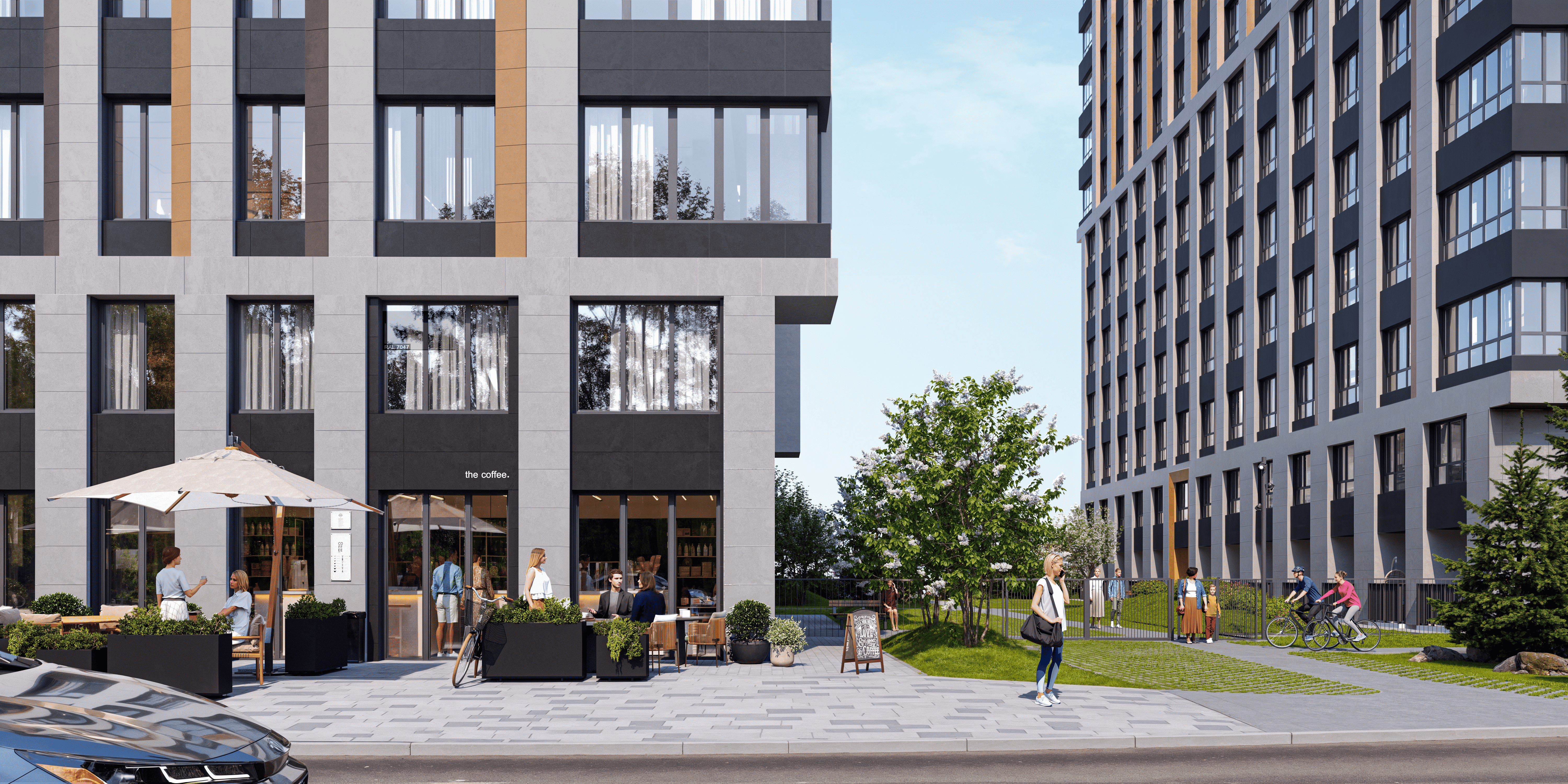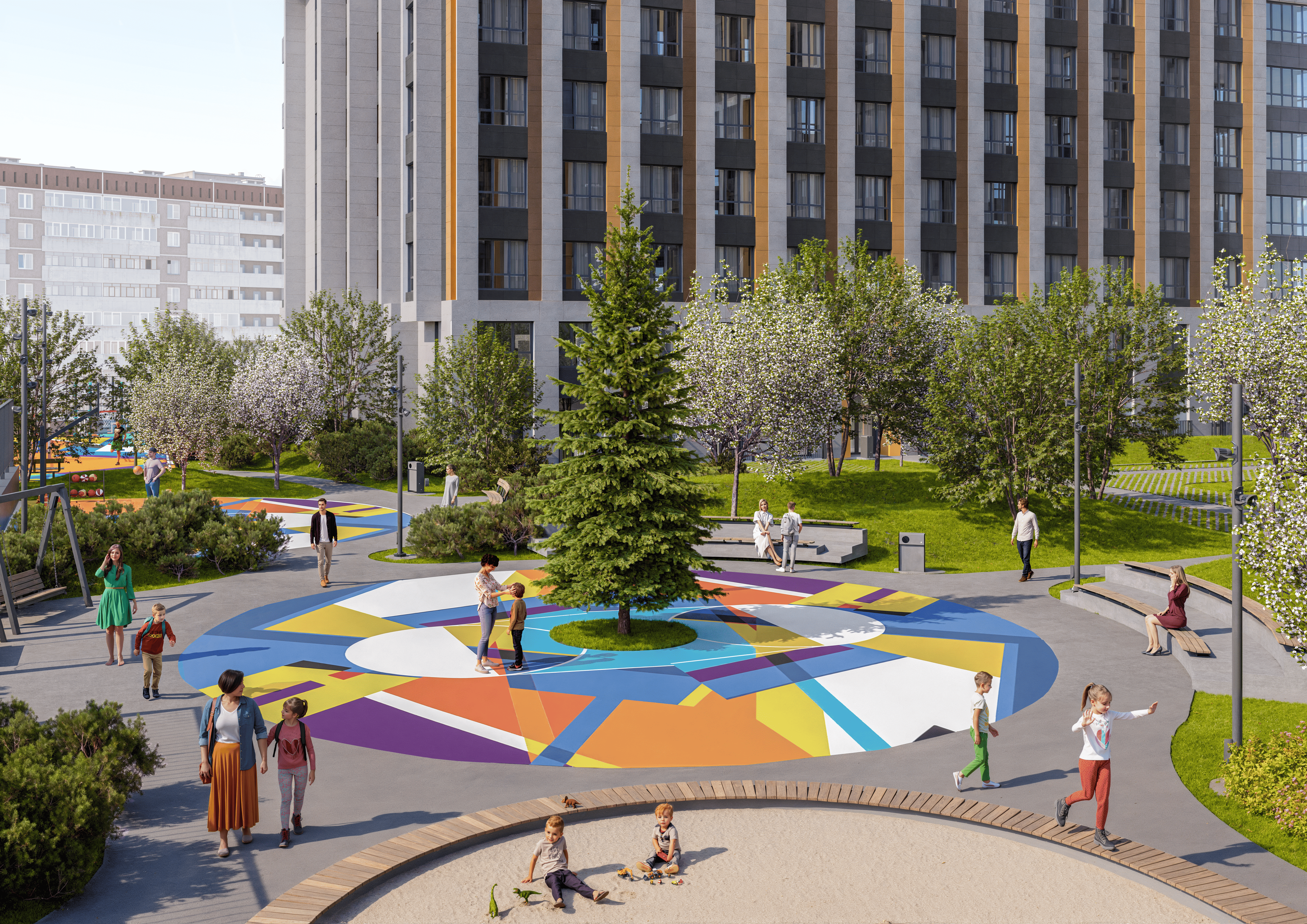 Двор комплекса это целый парк с игровыми площадками для маленьких жителей, спортивными площадками для молодежи и зонами для безмятежного отдыха для взрослых. Двор сохраняет приватность для жителей и в то же время предлагает насыщенную инфраструктуру для жизни.