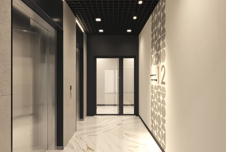 Холл в каждой башне встречает дизайнерской отделкой, где предусмотрены колясочные, места для велосипедов, лапомойки для домашних животных.