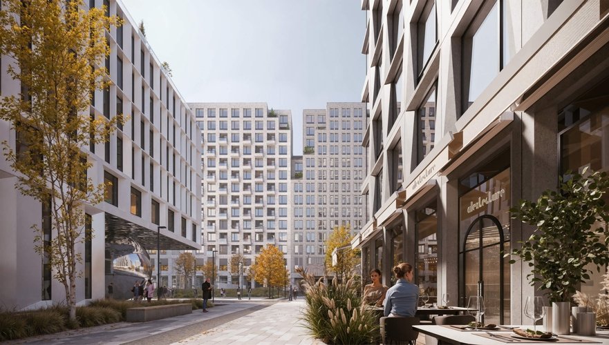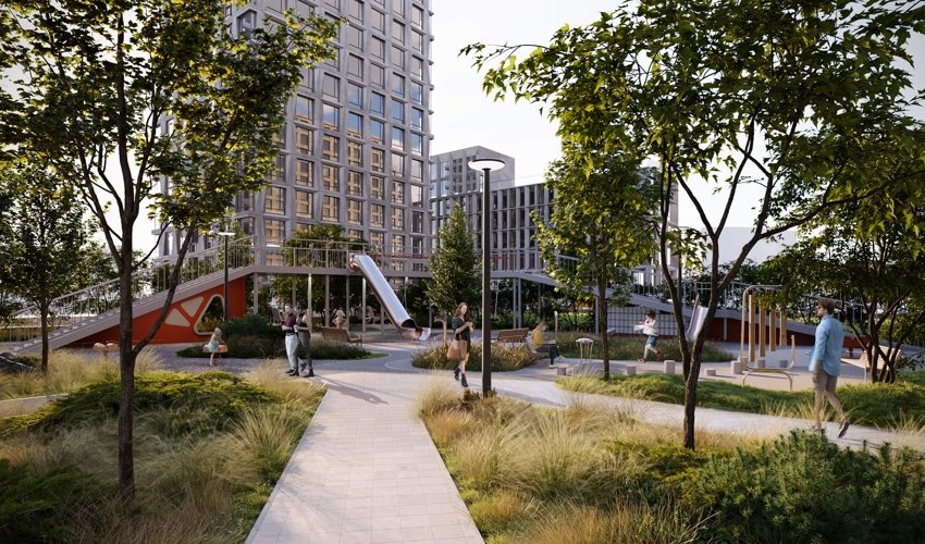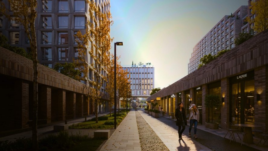 С северной стороны -два 10-этажных жилых корпуса, фланкирующие вход на Пешеходный бульвар.
